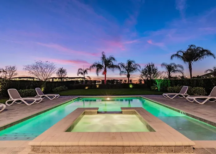 Rent The Perfect 5 Bedroom Villa Encore Resort Villa 6416 is located at a distance of 4.6 km from ChampionsGate Golf Club and provides an outdoor pool area, ensuring a relaxing stay. Guests can enjoy billiards at the villa, located approximately 7 km from Avatar Flight of Passage Tourist Information Center.